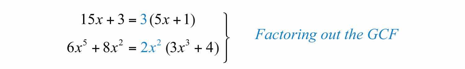 Factoring out the GCFThe process of rewriting a polynomial as a product using the GCF of all of its terms. involves rewriting a polynomial as a product where a factor is the GCF of all of its terms: