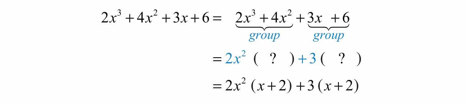 In this section, we outline a technique for factoring polynomials with four terms. First, review some preliminary examples where the terms have a common binomial factor.