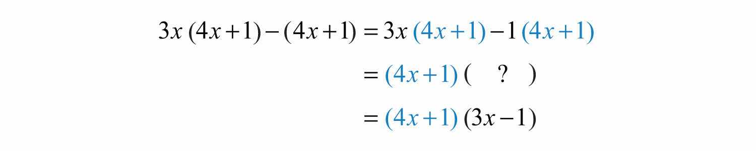 Solution: Rewrite the second term (4x+1) as 1(4x+1) and then factor out the common binomial factor (4x+1).