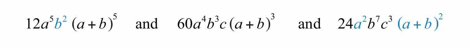Example 5: Determine the GCF of the following three expressions: 12a5b2(a+b)5, 60a4b3c(a+b)3, and 24a2b7c3(a+b)2.
