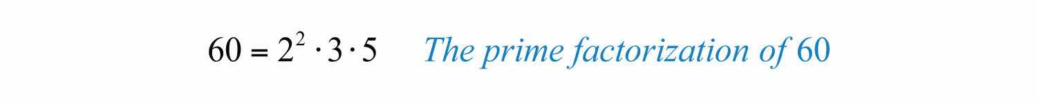 Any natural number greater than 1 can be uniquely written as a product of prime numbers. This product is called the prime factorizationThe unique factorization of a natural number written as a product of primes.. The prime factorization of 60 can be determined by continuing to factor until only a product of prime numbers remains.