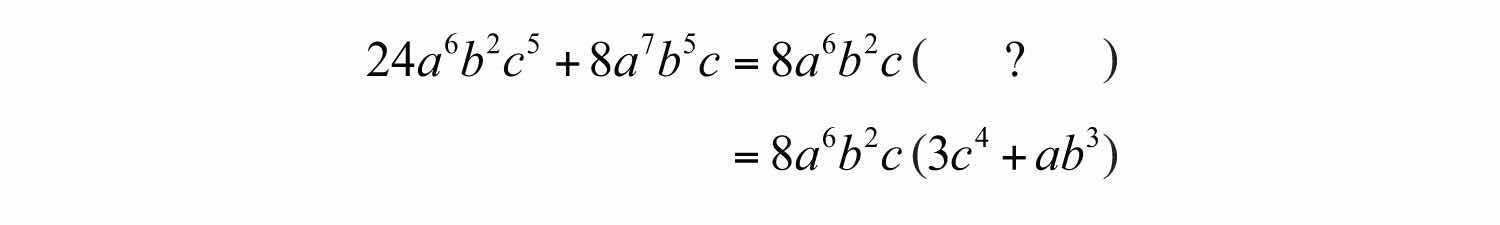 Solution: The GCF(24, 8) = 8, and the variable factors with smallest exponents are a6, b2, and c . Therefore, the GCF of all the terms is 8a6b2c.