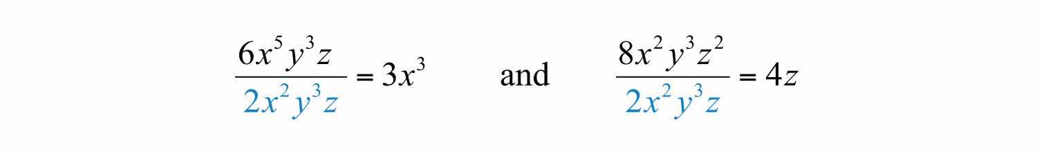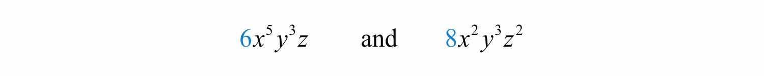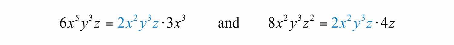 Given two or more monomials, it will be useful to find the greatest common monomial factor of each. For example, consider 6x5y3z and 8x2y3z2. The variable part of these two monomials look very much like the prime factorization of natural numbers and, in fact, can be treated the same way. Steps for finding the GCF of monomialsThe product of the GCF of the coefficients and all common variable factors. are outlined in the following example.