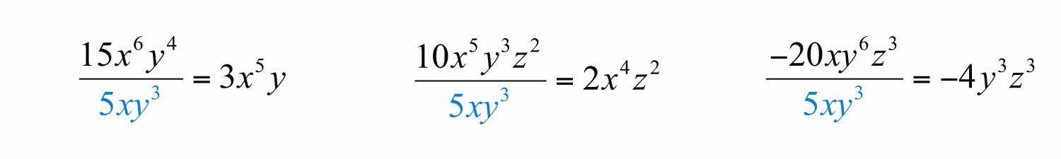 Solution: The GCF(10,15,20)=5, and the common variables with smallest exponent are x1 and y3. Therefore, the GCF of the terms is 5xy3. The first term does not have a variable factor of z and thus cannot be a part of the greatest common factor. If we divide each term by 5xy3, we obtain
