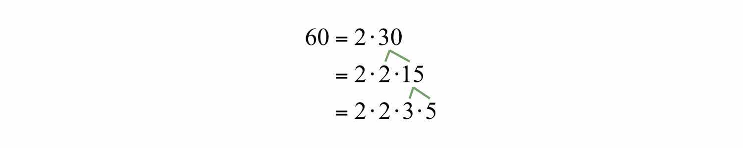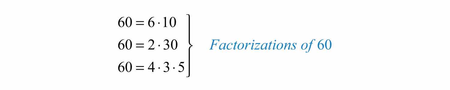 The process of writing a number or expression as a product is called factoringThe process of writing a number or expression as a product.. If we write 60 = 5 ⋅ 12, we say that the product 5 ⋅ 12 is a factorizationAny combination of factors, multiplied together, resulting in the product. of 60 and that 5 and 12 are factorsAny of the numbers or expressions that form a product.. Typically, there are many ways to factor a number. For example,