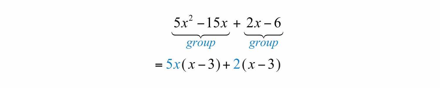 Solution: This expression is a binomial with terms 5x(x3) and 2(x3). In this case, (x3) is a common factor. Begin by factoring this common factor out: