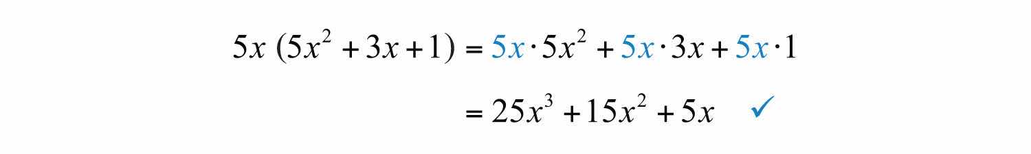 If the GCF is the same as one of the terms, then, after the GCF is factored out, a constant term 1 will remain. In the previous example, we can see that 5x5x=1. The importance of remembering the constant term becomes clear when performing the check using the distributive property: