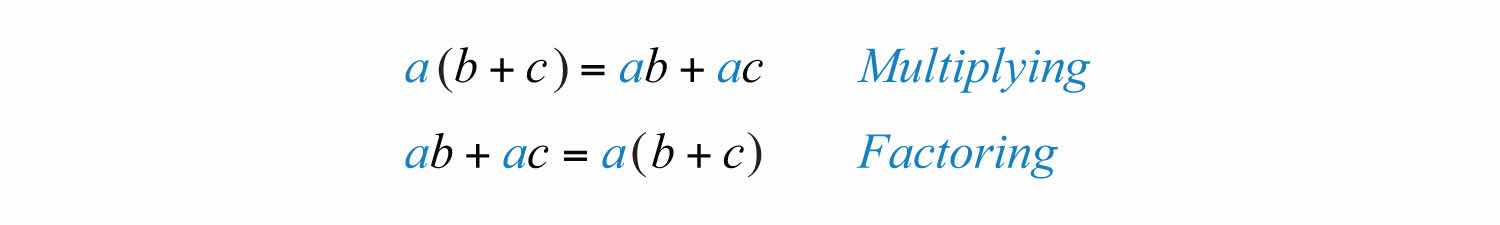 We have seen that application of the distributive property is the key to multiplying polynomials. The process of factoring a polynomialThe process of rewriting a polynomial as a product of polynomial factors. involves using the distributive property in reverse to write each polynomial as a product of polynomial factors.