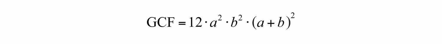 Answer: 12a2b2(a+b)2. Note that the variable c is not common to all three expressions and thus is not included in the GCF.