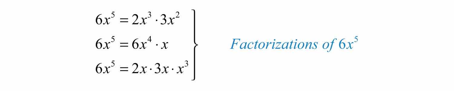 We next consider factorizations of monomials. For example, 6x and x4 are factors of 6x5 because 6x5=6xx4. Typically, there are many ways to factor a monomial. Some factorizations of 6x5 follow: