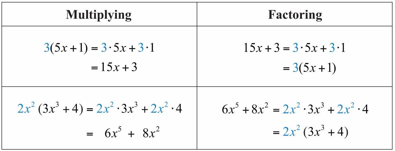 To demonstrate this idea, we multiply and factor side by side. Factoring utilizes the GCF of the terms.