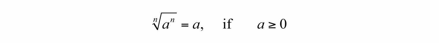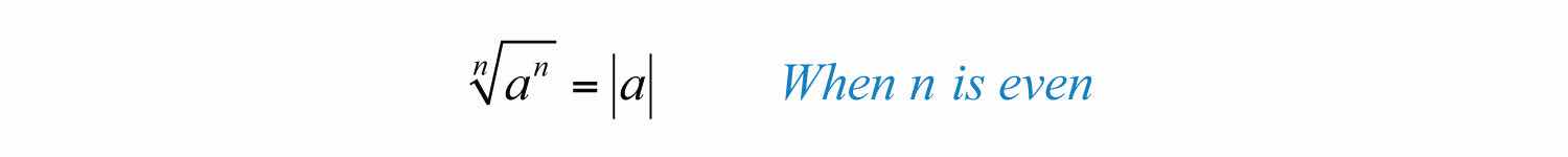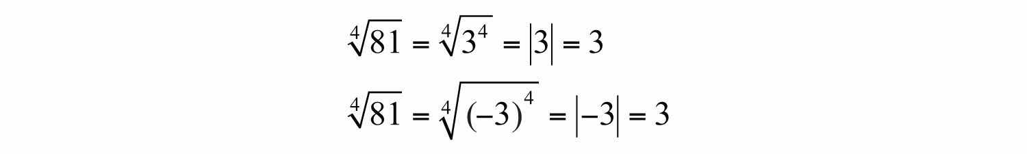 We have already taken care to define the principal square root of a number. At this point, we extend this idea to nth roots when n is even. For example, 3 is a fourth root of 81, because 34=81. And since (3)4=81, we can say that −3 is a fourth root of 81 as well. Hence we use the radical sign  n to denote the principal (nonnegative) nth rootThe positive nth root when n is even. when n is even. In this case, for any real number a, we use the following property: