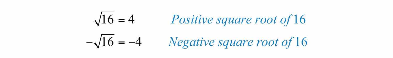 The square rootThe number that, when multiplied by itself, yields the original number. of a number is that number that when multiplied by itself yields the original number. For example, 4 is a square root of 16, because 4 2 =16. Since ( 4 ) 2 =16, we can say that −4 is a square root of 16 as well. Every positive real number has two square roots, one positive and one negative. For this reason, we use the radical sign   to denote the principal (nonnegative) square rootThe positive square root of a real number, denoted with the symbol  . and a negative sign in front of the radical   to denote the negative square root.