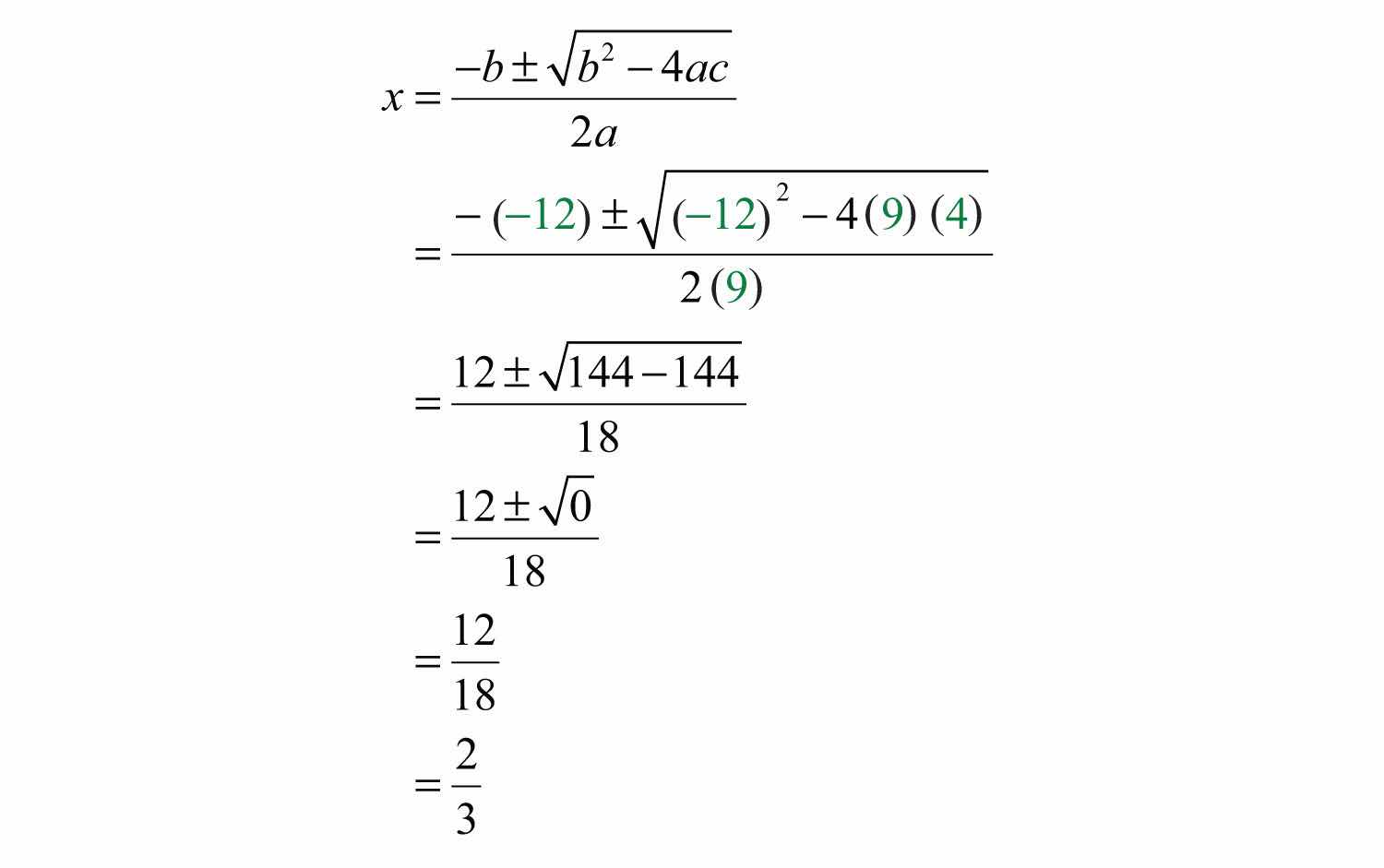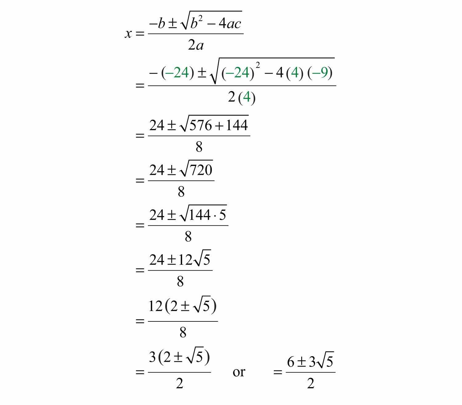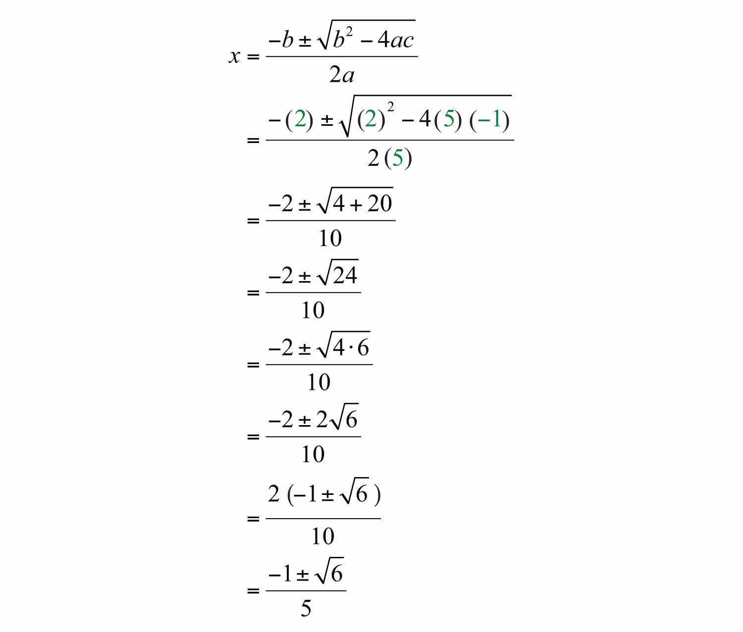 Substitute these values into the quadratic formula and then simplify.