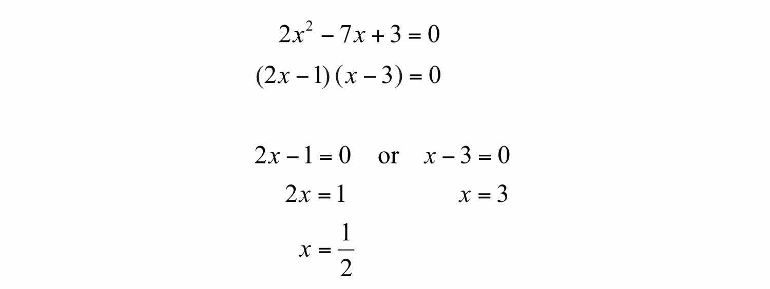Consider the quadratic equation 2x27x+3=0. It can be solved by factoring as follows:
