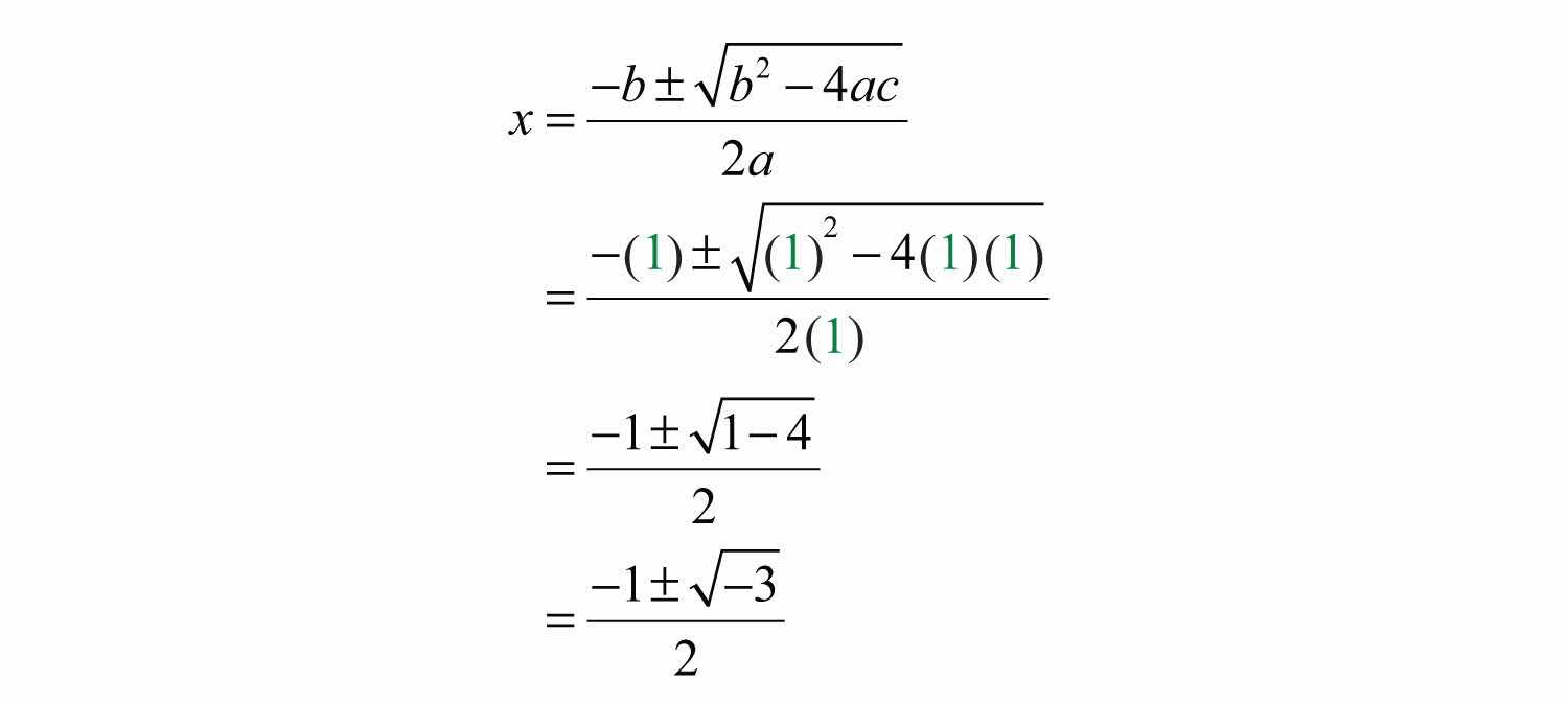 Example 5: Solve using the quadratic formula: x2+x+1=0.