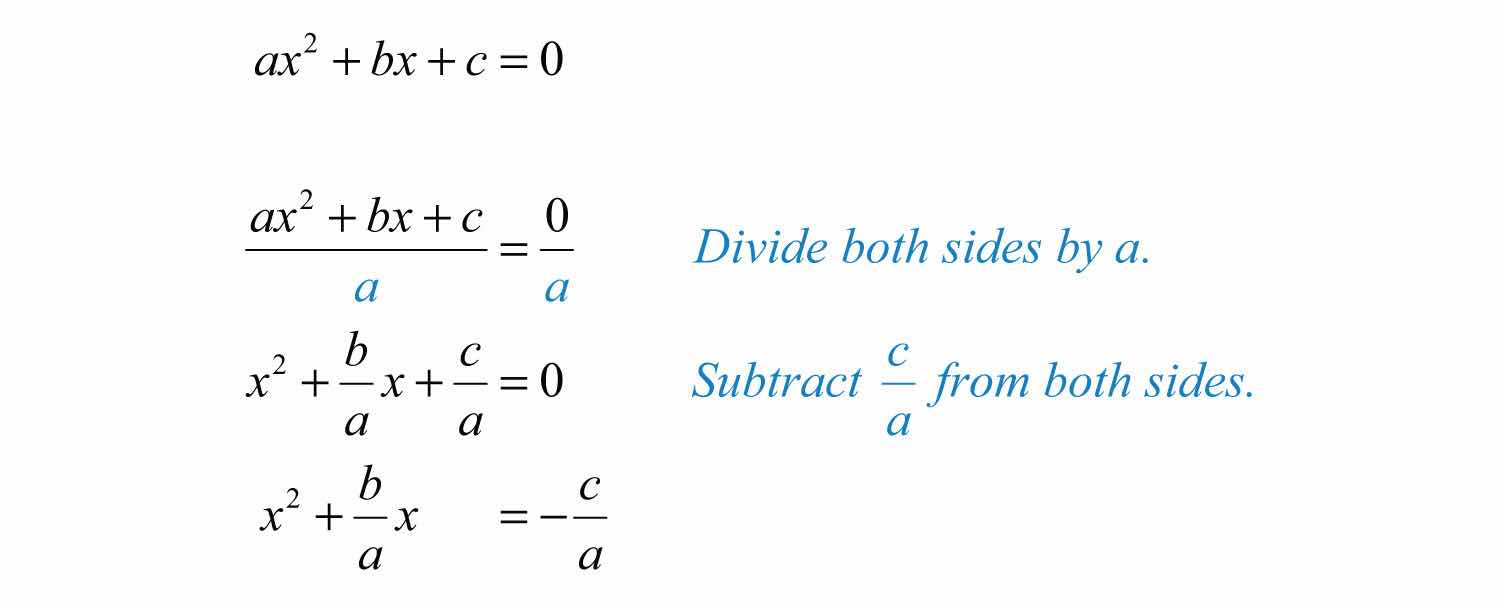 In this section, we will develop a formula that gives the solutions to any quadratic equation in standard form. To do this, we begin with a general quadratic equation in standard form and solve for x by completing the square. Here a, b, and c are real numbers and a0: