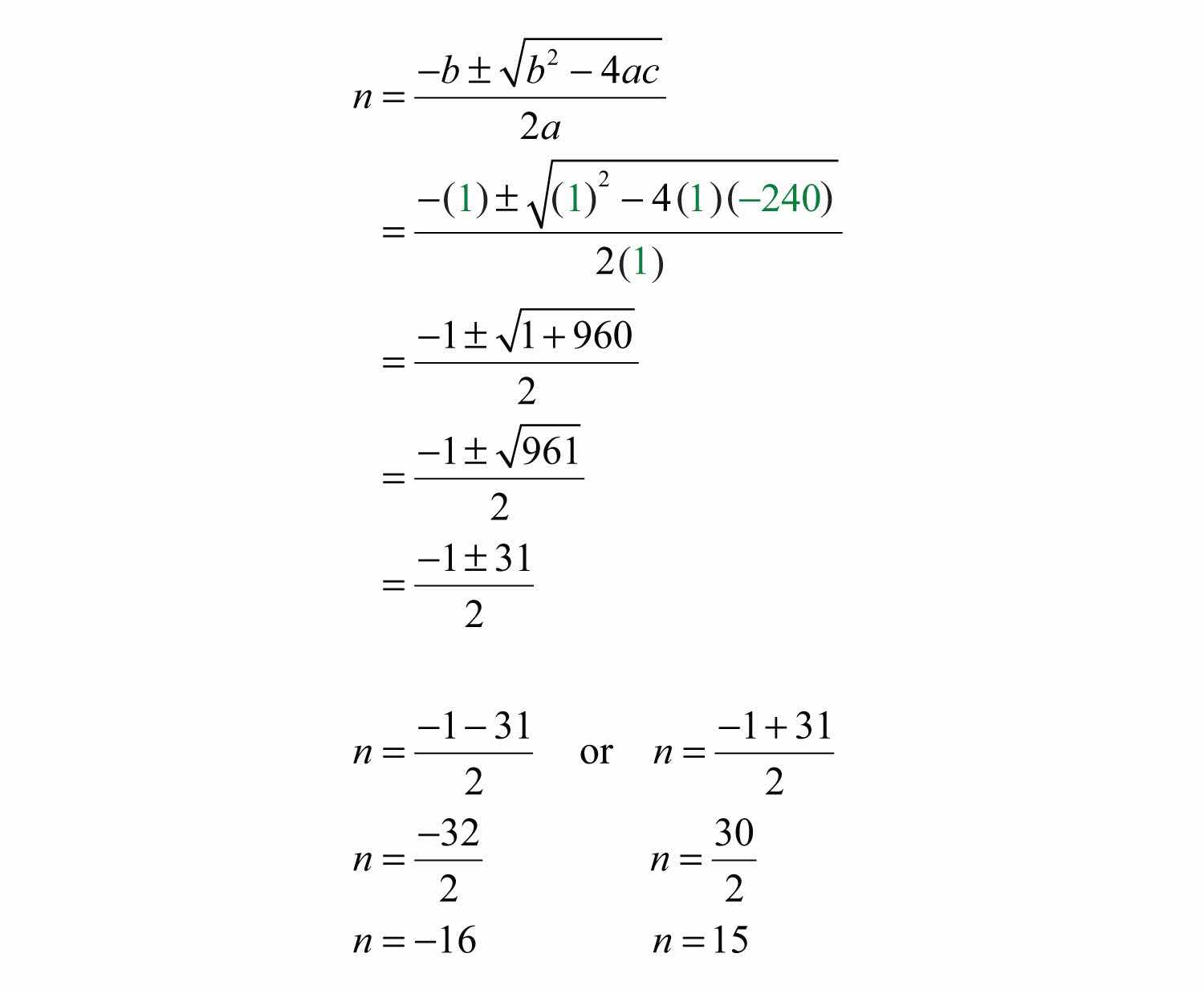 Since the problem calls for positive integers, disregard the negative solution and choose n = 15.