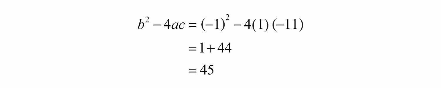 Use the coefficients, a = 1, b = −1, and c = −11, to determine the type of solutions.