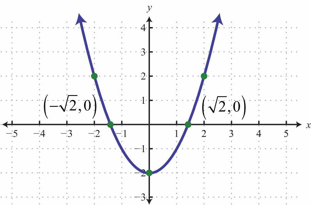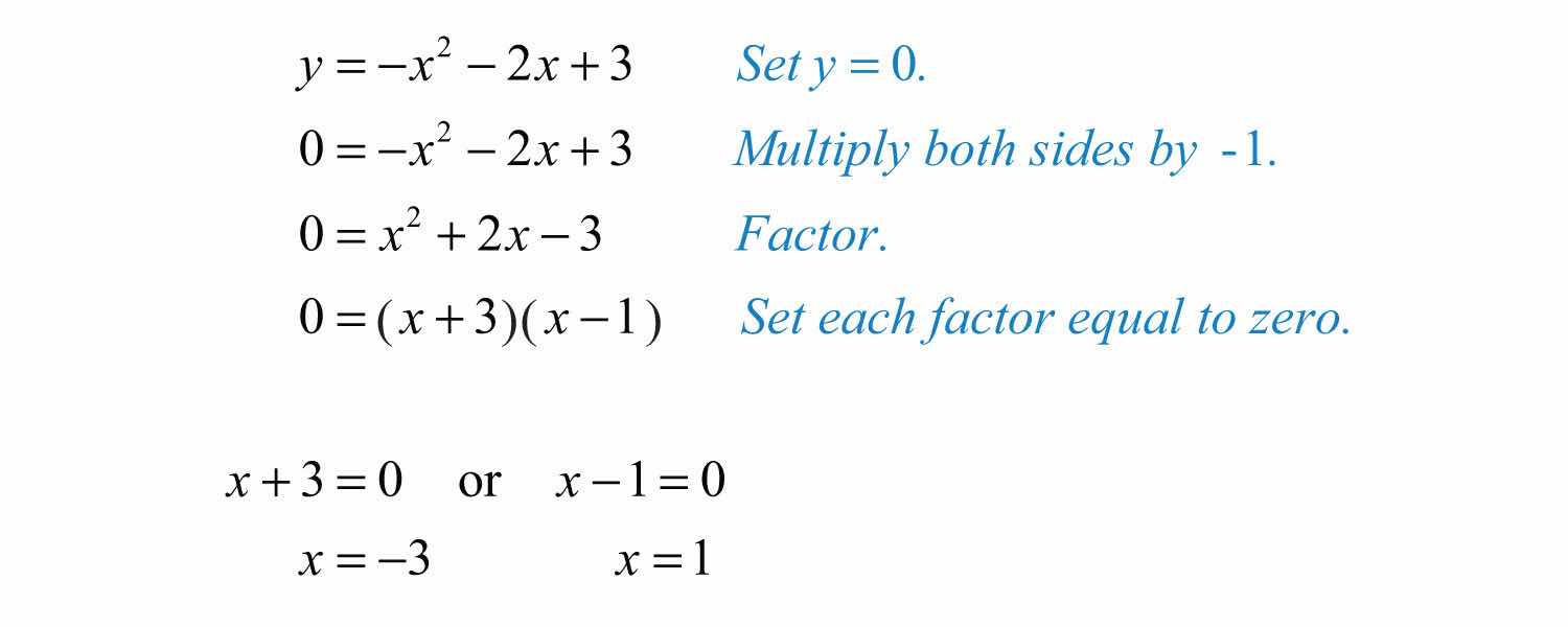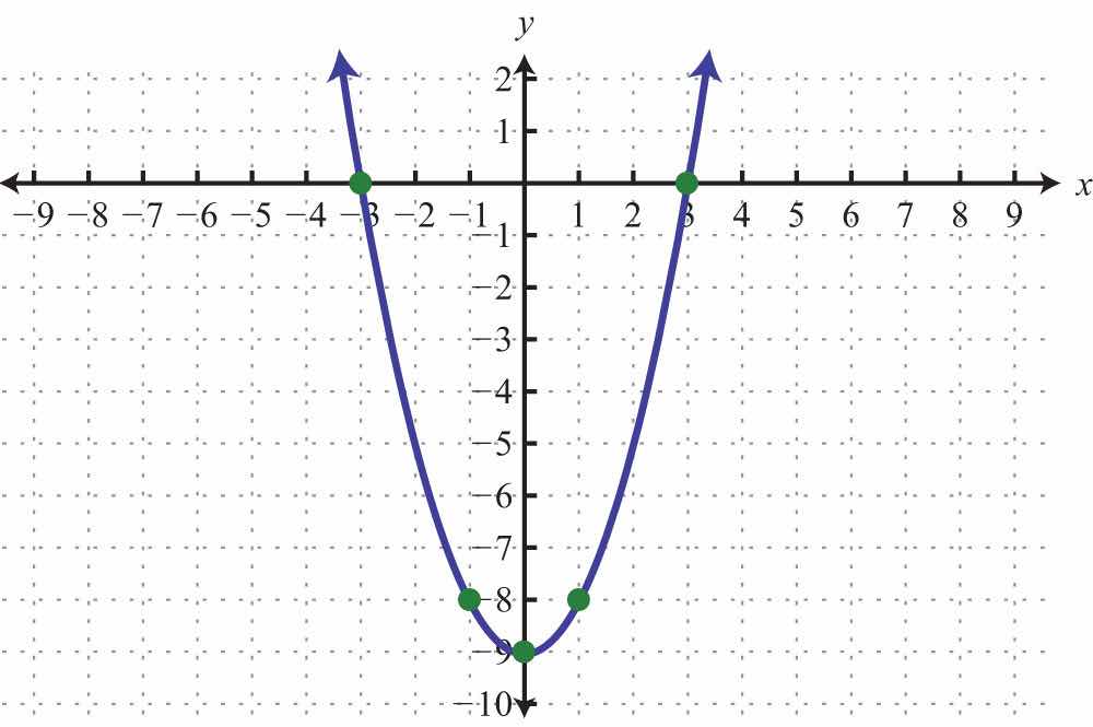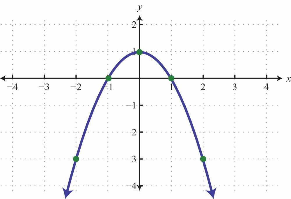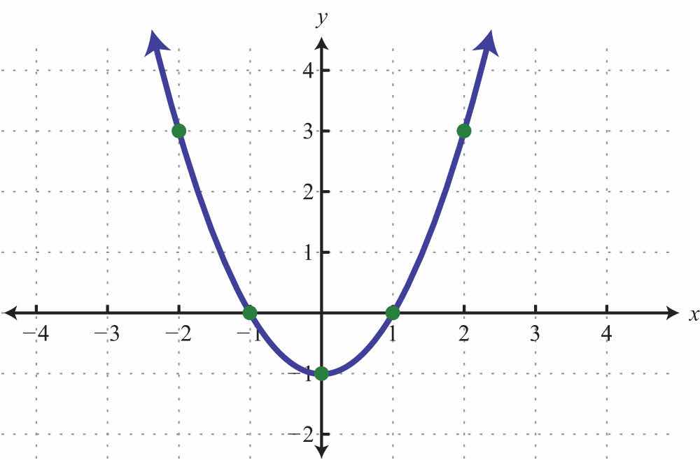 Solution: Since a = 1, the parabola opens upward. Furthermore, c = −1, so the y-intercept is (0, −1). To find the x-intercepts, set y = 0.