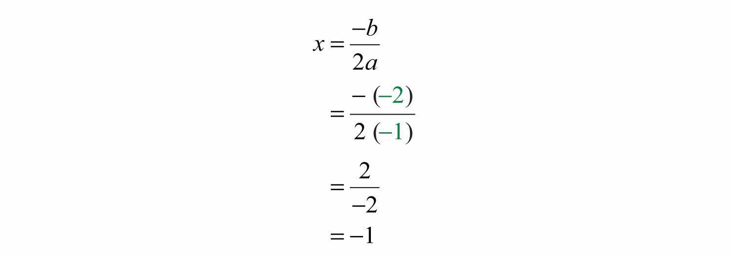 Step 3: Determine the vertex. One way to do this is to use the equation for the line of symmetry, , to find the x-value of the vertex. In this example, a = −1 and b = −2: