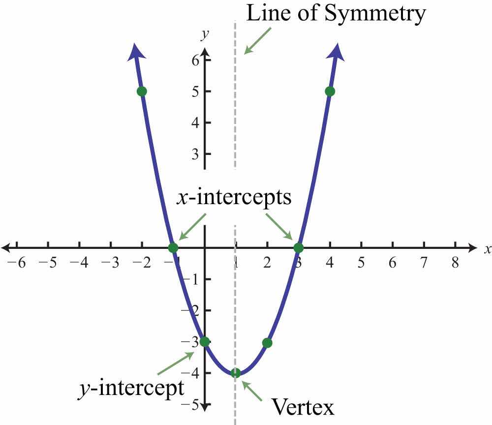 When graphing, we want to include certain special points in the graph. The y-intercept is the point where the graph intersects the y-axis. The x-intercepts are the points where the graph intersects the x-axis. The vertexThe point that defines the minimum or maximum of a parabola. is the point that defines the minimum or maximum of the graph. Lastly, the line of symmetryThe vertical line through the vertex, , about which the parabola is symmetric. (also called the axis of symmetryA term used when referencing the line of symmetry.) is the vertical line through the vertex, about which the parabola is symmetric.