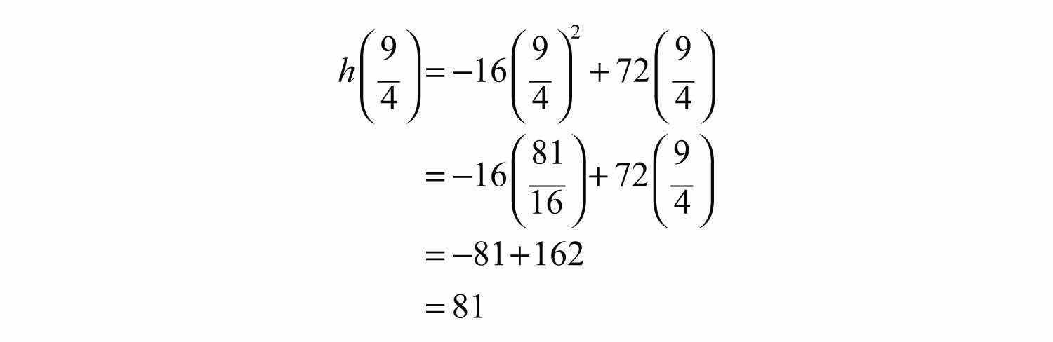 The maximum height will occur in 9/4 = 2¼ seconds. Substitute this time into the function to determine the height attained.