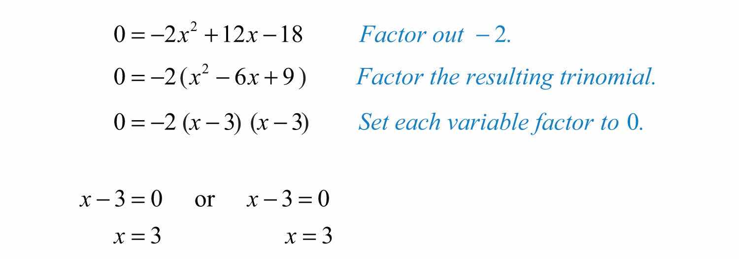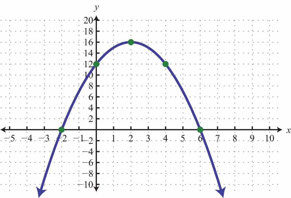 Solution: Note that a = −2: the parabola opens downward. Since c = −18, the y-intercept is (0, −18). To find the x-intercepts, set y = 0.