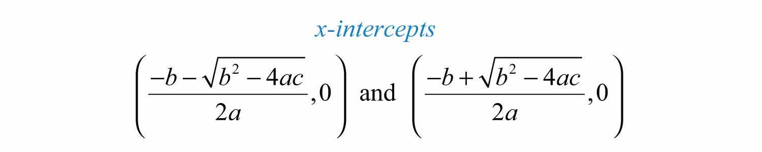 Next, recall that the x-intercepts, if they exist, can be found by setting . Doing this, we have , which has general solutions given by the quadratic formula, . Therefore, the x-intercepts have this general form:
