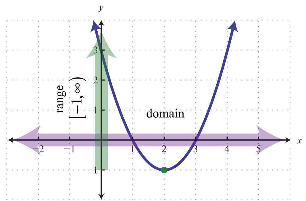 The vertex is (2, −1). The range consists of the set of y-values greater than or equal to the minimum y-value −1.