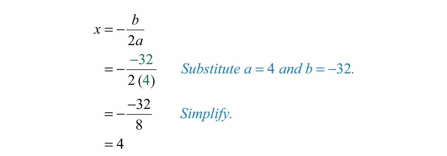 Solution: Since a = −4, we know that the parabola opens downward and there will be a maximum y-value. To find it, we first find the x-value of the vertex.