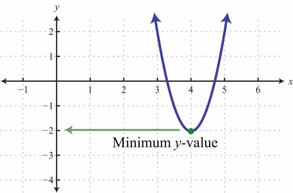 The vertex is (4, −2). Therefore, the minimum y-value of −2 occurs when x = 4, as illustrated below: