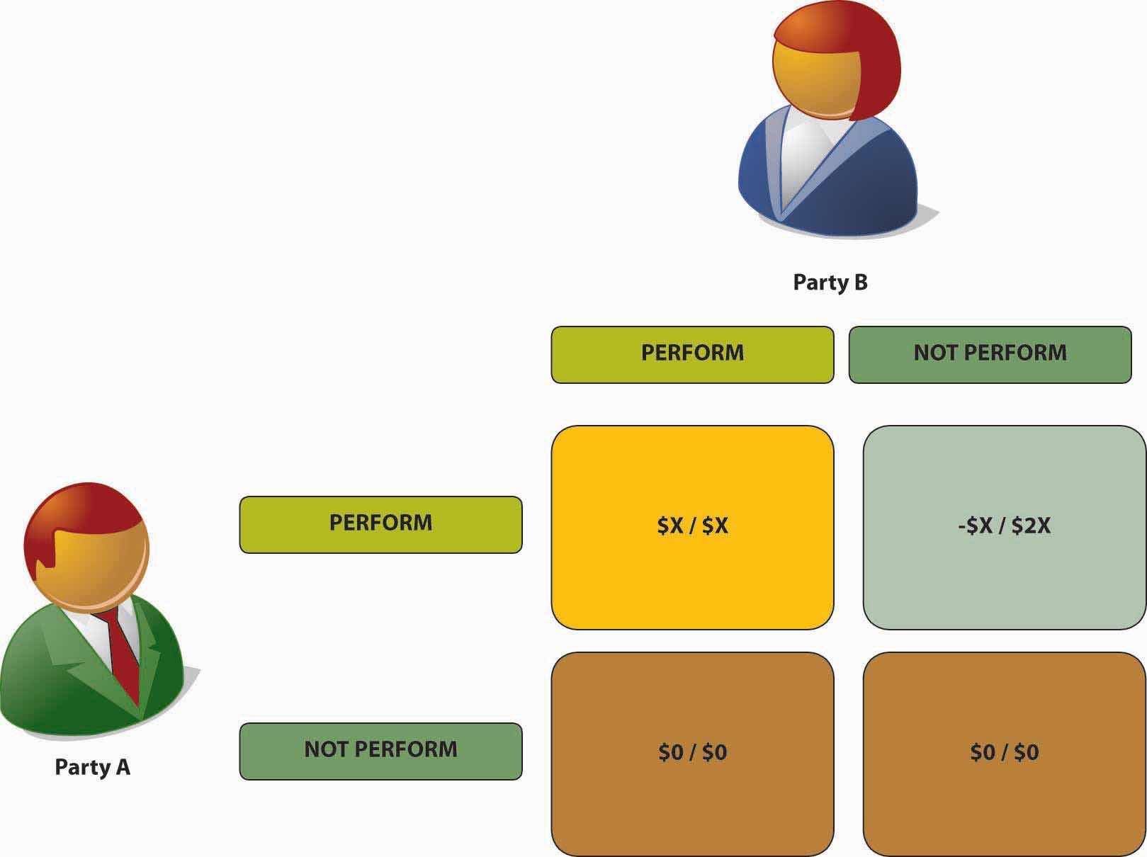 Let’s say, for example, that you (hereinafter “Party A”) enter into a contract with Party B.This section is based on Daniel H. Cole and Peter Z. Grossman, Principles of Law and Economics (Upper Saddle River, NJ: Pearson Education, 2005), 156. The grid in Figure 16.8 "Contract Game" shows all the possible outcomes of this agreement. If you both perform as contracted, you both benefit from the bargain, each realizing a profit of $X. This is the result in the upper-left–hand box of the grid. Let’s say, however, that Party B takes your money but fails to live up to her end of the bargain. In that case, we get the outcome in the upper-right–hand box: because you’ve lost your money, you end up with –$X, and because Party B got your money without spending hers, she ends up with $2X. Understandably, you don’t intend for this to happen and so stipulate that Party B must perform her end of the bargain before you hand over your money. Fearing that you might not pay after she’s lived up to her part of the contract, Party B demands payment before she performs her part. The inevitable result of the contract is now displayed in both lower boxes of the grid: no one does anything and no one earns any profit. In completely wasting the value of every resource committed to the agreement by Party A and Party B, the business process has reached the ultimate level of inefficiency; it’s actually ground to a halt.