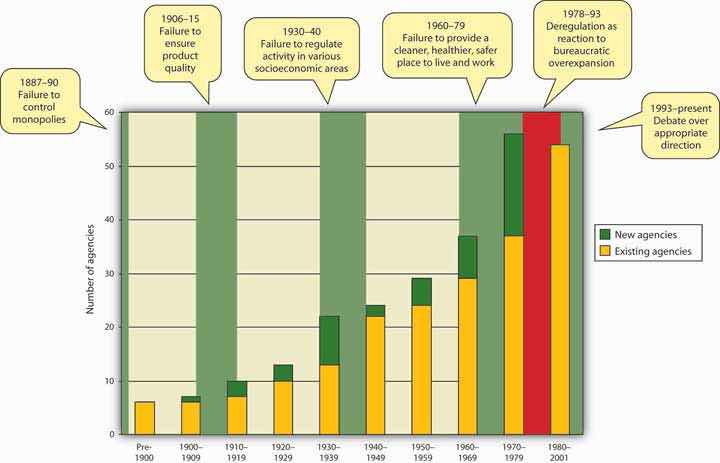 Responsibility for implementing the OSHAct is delegated to the Department of Labor, making OSHA one of more than fifty agencies managed by the executive branch of the federal government. Figure 16.9 "Administrative Agencies" shows the growth of federal administrative agencies from the end of the nineteenth century to the present. As you can see, periods of significant increase in the creation of such agencies tend to correspond to eras of perceived market failure—that is, the failure of unregulated market activity to maintain certain levels of fairness or social responsibility.See Kenneth F. Warren, Administrative Law in the Political System, 4th ed. (Boulder, CO: Westview Press, 2004), 41-43, http://books.google.com/books?id=AZVD_QM1QlYC&ie=ISO-8859-1&output=html (accessed November 12, 2011).