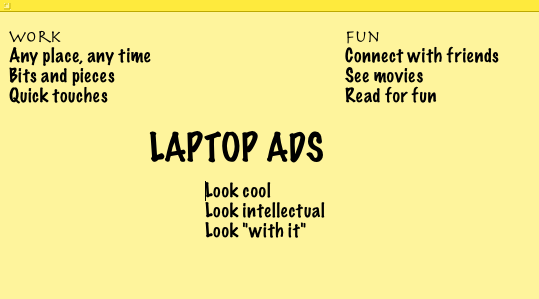 After doing this for several minutes, you should then look over your jottings to see if any patterns appear. For instance, from my notes above you can see how these commercials might let students think that laptops make it easy for them to look intellectual and do their work in bits and pieces. In addition, this implies that they can use this one product to manage the “lighter side” of their lives—social interactions and relaxation (reading, watching movies).