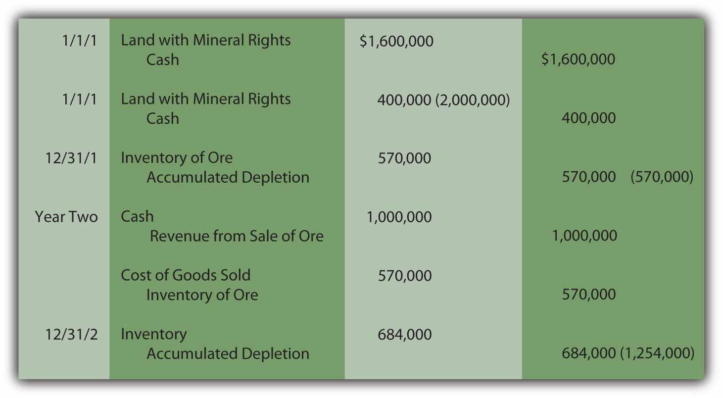 Assume that 3,000 tons of ore are extracted in Year One and sold in Year Two for $1 million cash. Another 3,600 tons are removed in the second year for sale at a later time. Depletion is $570,000 in Year One ($190 × 3,000 tons) and $684,000 in Year Two ($190 × 3,600 tons).