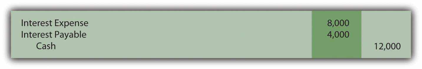 When the next $12,000 interest payment is made by Brisbane on May 1, Year Two, the recorded $4,000 liability is extinguished and interest for four additional months (January through April) is recognized. The appropriate expense for this period is $8,000 or $400,000 × 6 percent × 4/12 year. Mechanically, this payment could be recorded in more than one way but the following journal entry is probably the easiest to follow. Interest expense for the first two months was recorded in Year One with interest for the next four months recorded here in Year Two.