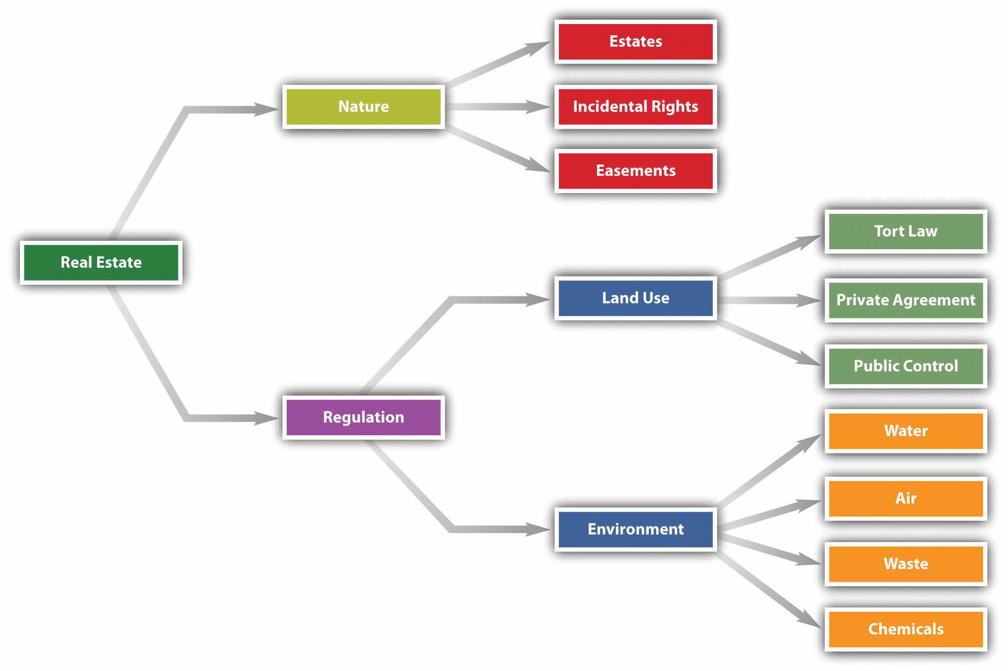In this chapter and in Chapter 31 "The Transfer of Real Estate by Sale" and Chapter 32 "Landlord and Tenant Law", we focus on regulation of land use and the environment (see Figure 28.1 "Chapter Overview"). We divide our discussion of the nature of real estate into three major categories: (1) estates; (2) rights that are incidental to the possession and ownership of land—for example, the right to air, water, and minerals; and (3) easements—the rights in lands of others.