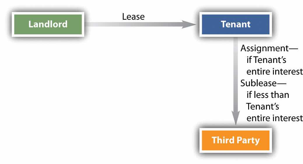 The tenant can transfer her interest in the lease by assigning or by subletting. In an assignmentThe tenant transfers all interest in the premises, along with all obligations., the tenant transfers all interest in the premises and all obligations. Thus the assignee-tenant is duty bound to pay the landlord the periodic rental and to perform all other provisions in the lease. If the assignee defaulted, however, the original tenant would remain liable to the landlord. In short, with an assignment, both assignor and assignee are liable under the lease unless the landlord releases the assignor. By contrast, a subleaseA transfer of something less than the entire leasehold interest. is a transfer of something less than the entire leasehold interest (see Figure 32.1 "Assignment vs. Sublease"). For instance, the tenant might have five years remaining on her lease and sublet the premises for two years, or she might sublet the ground floor of a four-story building. Unlike an assignee, the subtenant does not step into the shoes of the tenant and is not liable to the landlord for performance of the tenant’s duties. The subtenant’s only obligations are to the tenant. What distinguishes the assignment from the sublease is not the name but whether or not the entire leasehold interest has been transferred. If not, the transfer is a sublease.
