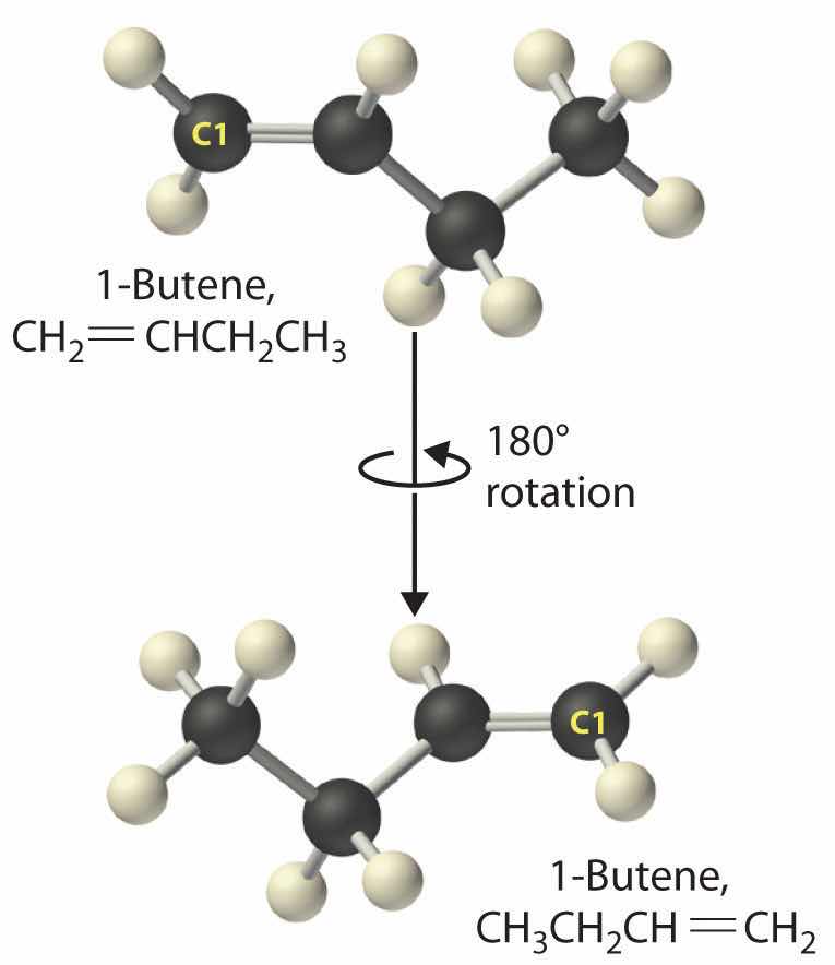 The name of a compound does not depend on its orientation. As illustrated for 1-butene, both condensed structural formulas and molecular models show different orientations of the same molecule. Don’t let orientation fool you; you must be able to recognize the same structure no matter what its orientation.