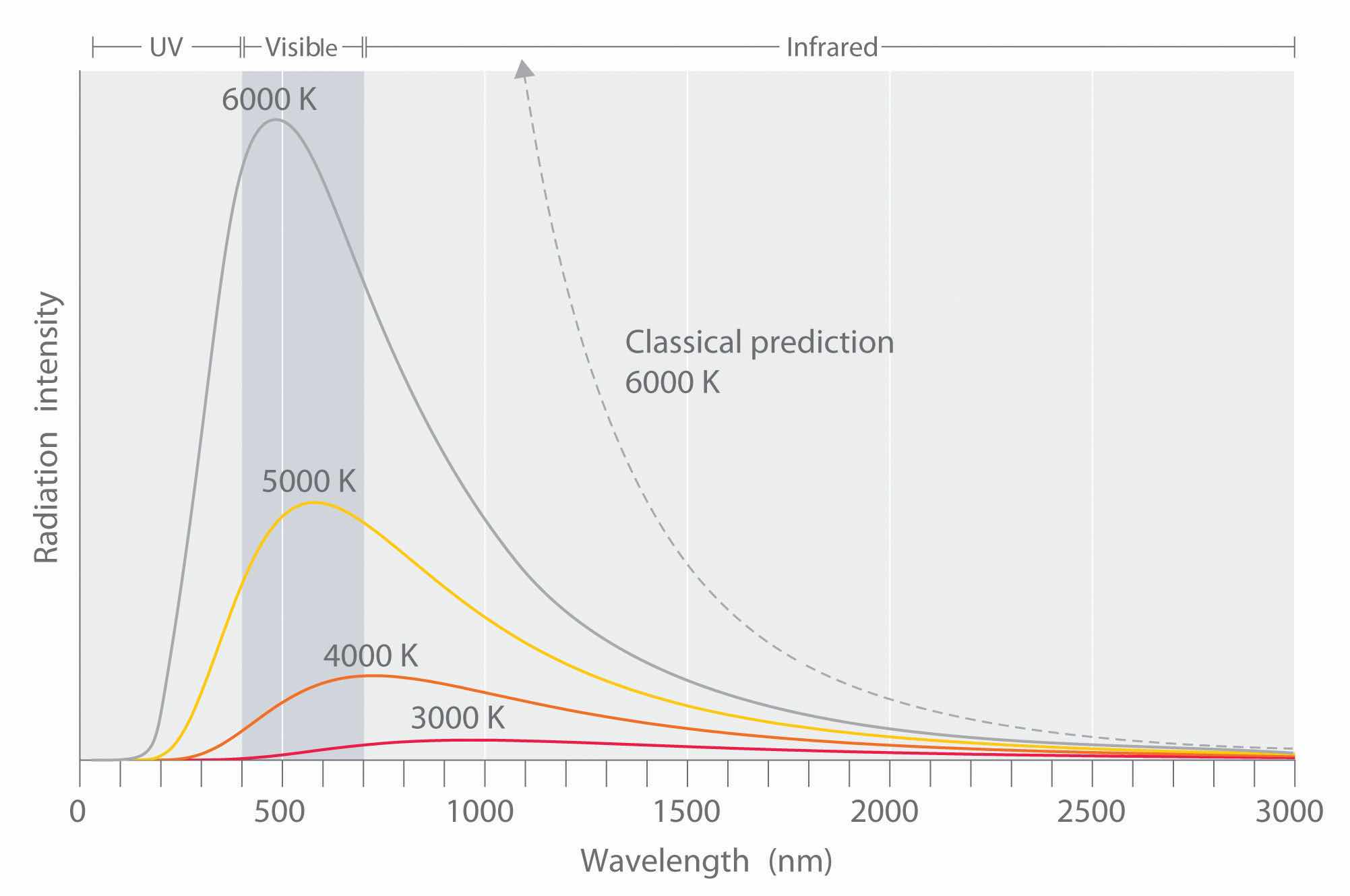 At relatively low temperatures, most radiation is emitted at wavelengths longer than 700 nm, which is in the infrared portion of the spectrum. The dull red glow of the electric stove element in Figure 6.5 "Blackbody Radiation" is due to the small amount of radiation emitted at wavelengths less than 700 nm, which the eye can detect. As the temperature of the object increases, the maximum intensity shifts to shorter wavelengths, successively resulting in orange, yellow, and finally white light. At high temperatures, all wavelengths of visible light are emitted with approximately equal intensities. The white light spectrum shown for an object at 6000 K closely approximates the spectrum of light emitted by the sun (Figure 6.14 "The Visible Spectrum of Sunlight"). Note the sharp decrease in the intensity of radiation emitted at wavelengths below 400 nm, which constituted the ultraviolet catastrophe. The classical prediction fails to fit the experimental curves entirely and does not have a maximum intensity.