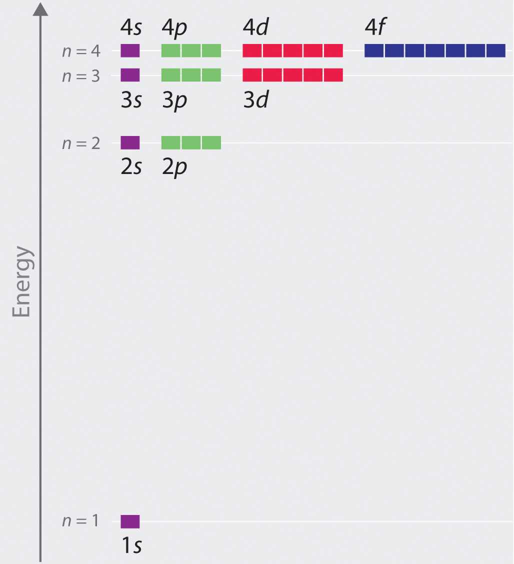 Each box corresponds to one orbital. Note that the difference in energy between orbitals decreases rapidly with increasing values of n.