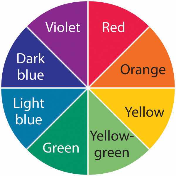 The magnitude of the energy gap between an excited state and a ground state determines the color of visible light that is absorbed. The observed color of an object is not the color of the light it absorbs but rather the complement of that color. The accompanying rosette, first developed by Isaac Newton, shows the colors increasing in energy from red to violet. Any two colors that are opposite each other are said to be complementary (e.g., red and green are complementary).