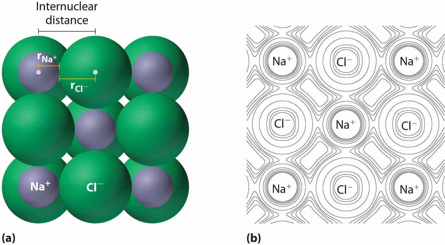 (a) The internuclear distance is apportioned between adjacent cations and anions in the ionic structure, as shown here for Na+ and Cl− in sodium chloride. (b) This depiction of electron density contours for a single plane of atoms in the NaCl structure shows how the lines connect points of equal electron density. Note the relative sizes of the electron density contour lines around Cl− and Na+.