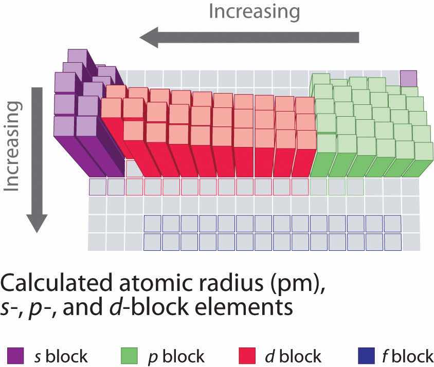 Because it is impossible to measure the sizes of both metallic and nonmetallic elements using any one method, chemists have developed a self-consistent way of calculating atomic radii using the quantum mechanical functions described in Chapter 6 "The Structure of Atoms". Although the radii values obtained by such calculations are not identical to any of the experimentally measured sets of values, they do provide a way to compare the intrinsic sizes of all the elements and clearly show that atomic size varies in a periodic fashion (Figure 7.6 "A Plot of Periodic Variation of Atomic Radius with Atomic Number for the First Six Rows of the Periodic Table"). In the periodic table, atomic radii decrease from left to right across a row and increase from top to bottom down a column. Because of these two trends, the largest atoms are found in the lower left corner of the periodic table, and the smallest are found in the upper right corner (Figure 7.7 "Calculated Atomic Radii (in Picometers) of the ").