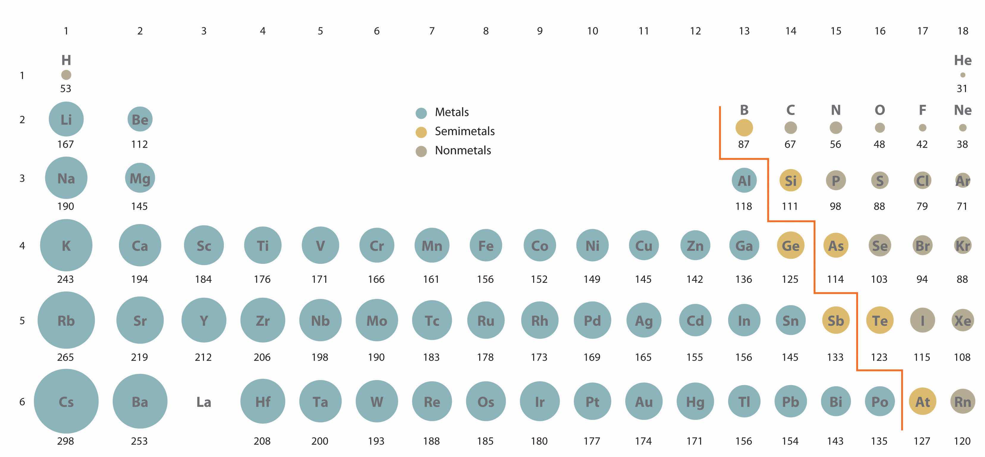 The sizes of the circles illustrate the relative sizes of the atoms. The calculated values are based on quantum mechanical wave functions.