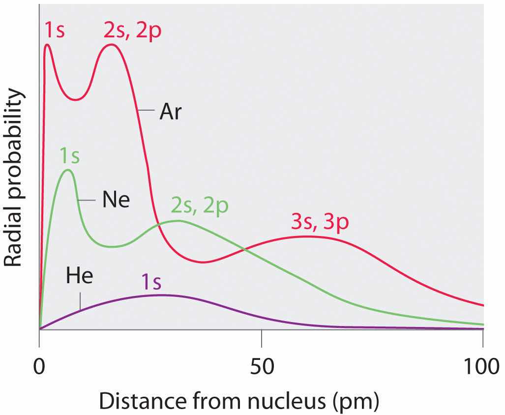 In He, the 1s electrons have a maximum radial probability at ≈30 pm from the nucleus. In Ne, the 1s electrons have a maximum at ≈8 pm, and the 2s and 2p electrons combine to form another maximum at ≈35 pm (the n = 2 shell). In Ar, the 1s electrons have a maximum at ≈2 pm, the 2s and 2p electrons combine to form a maximum at ≈18 pm, and the 3s and 3p electrons combine to form a maximum at ≈70 pm.