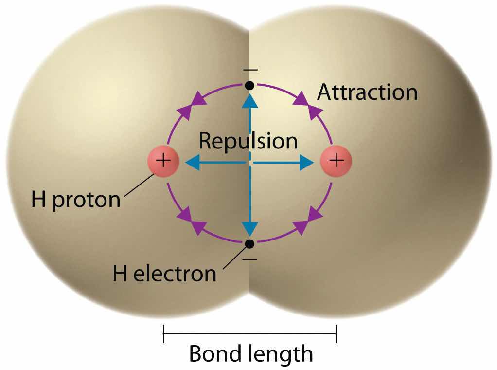 At long distances, both attractive and repulsive interactions are small. As the distance between the atoms decreases, the attractive electron–proton interactions dominate, and the energy of the system decreases. At the observed bond distance, the repulsive electron–electron and proton–proton interactions just balance the attractive interactions, preventing a further decrease in the internuclear distance. At very short internuclear distances, the repulsive interactions dominate, making the system less stable than the isolated atoms.