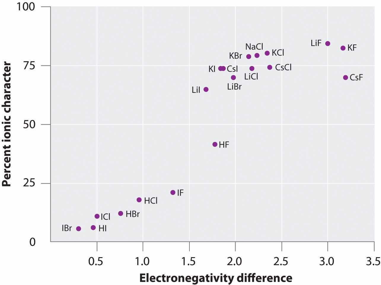 The charge on the atoms of many substances in the gas phase can be calculated using measured dipole moments and bond distances. Figure 8.14 "A Plot of the Percent Ionic Character of a Bond as Determined from Measured Dipole Moments versus the Difference in Electronegativity of the Bonded Atoms" shows a plot of the percent ionic character versus the difference in electronegativity of the bonded atoms for several substances. According to the graph, the bonding in species such as NaCl(g) and CsF(g) is substantially less than 100% ionic in character. As the gas condenses into a solid, however, dipole–dipole interactions between polarized species increase the charge separations. In the crystal, therefore, an electron is transferred from the metal to the nonmetal, and these substances behave like classic ionic compounds. The data in Figure 8.14 "A Plot of the Percent Ionic Character of a Bond as Determined from Measured Dipole Moments versus the Difference in Electronegativity of the Bonded Atoms" show that diatomic species with an electronegativity difference of less than 1.5 are less than 50% ionic in character, which is consistent with our earlier description of these species as containing polar covalent bonds. The use of dipole moments to determine the ionic character of a polar bond is illustrated in Example 11.