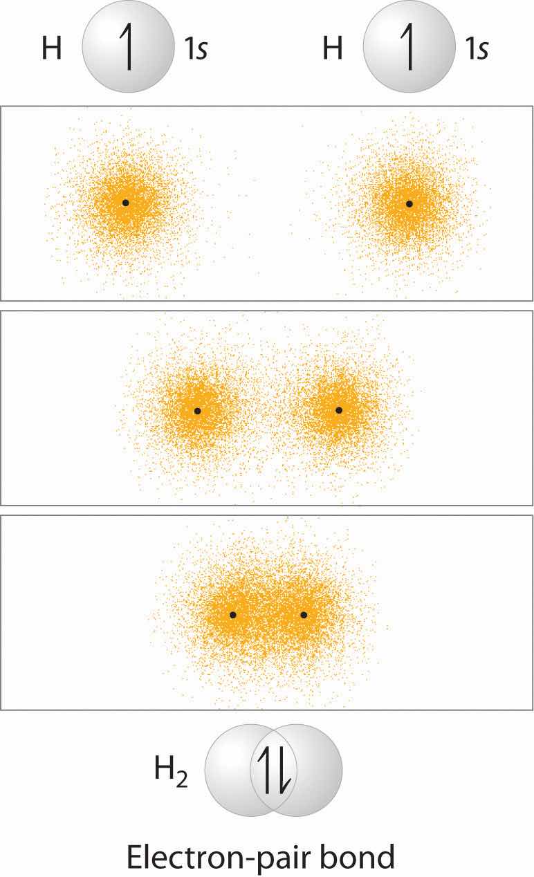 The formation of H2 from two hydrogen atoms, each with a single electron in a 1s orbital, occurs as the electrons are shared to form an electron-pair bond, as indicated schematically by the gray spheres and black arrows. The orange electron density distributions show that the formation of an H2 molecule increases the electron density in the region between the two positively charged nuclei.